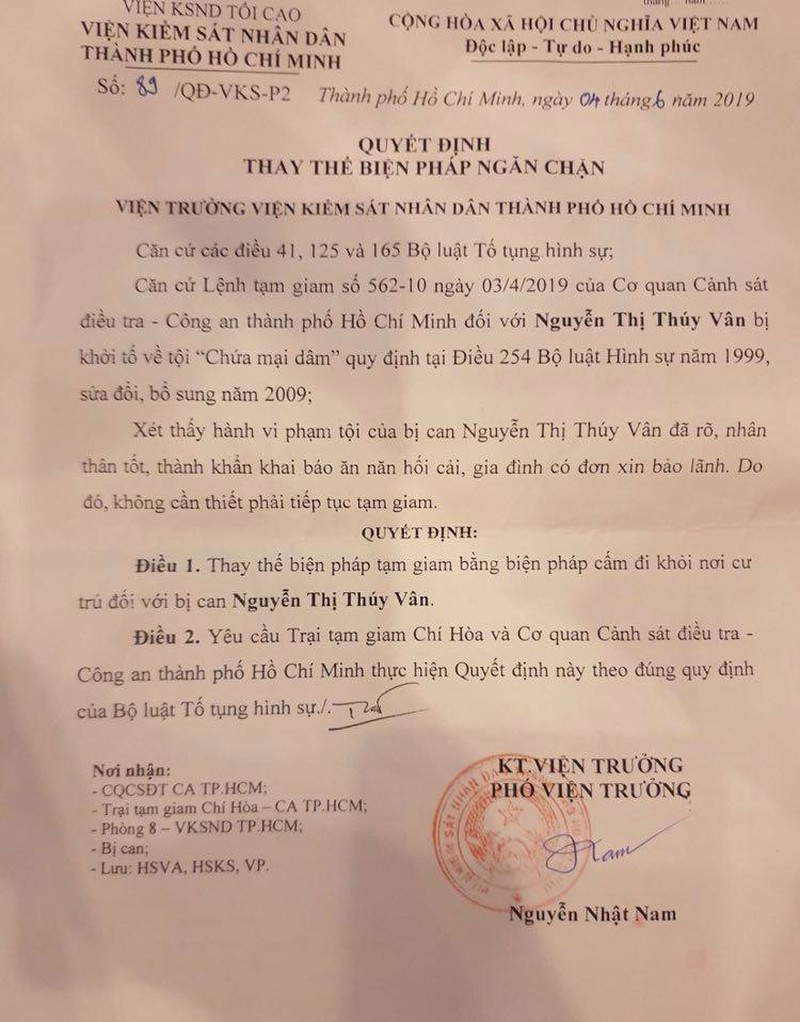 Ngày 4-6, VKSND TP.HCM xét thấy tội phạm của Vân đã rõ, bị can có nhân thân tốt, thành khẩn khai báo, ăn năn hối cải, gia đình có đơn xin bảo lãnh. Do đó, VKS đã ra quyết định thay thế biện pháp ngăn chặn đối với Vân. Theo quyết định này, Vân sẽ phải chấp hành biện pháp cấm đi khỏi nơi cư trú thay vì tạm giam. Vân bị tạm giam từ ngày 12-10-2015, tính đến ngày thay đổi biện pháp ngăn chặn, Vân đã bị tam giam ba năm tám tháng.