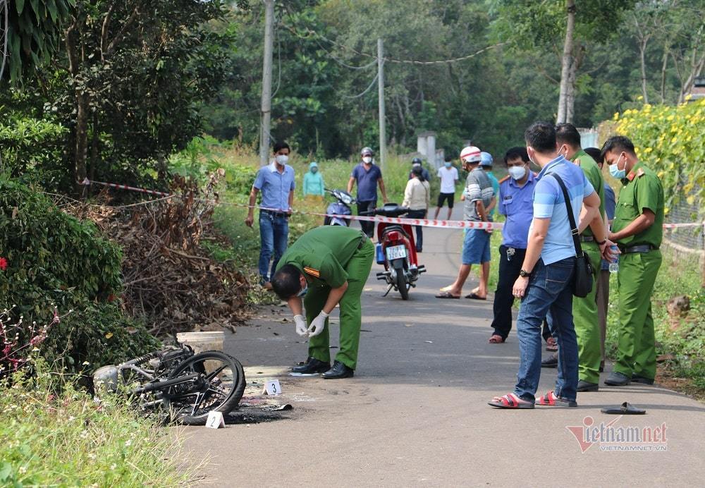 Dấu vết đầu tiên là hiện trường chiếc xe máy bị cháy rụi, bên cạnh còn có một cái xô và nhiều vết máu.