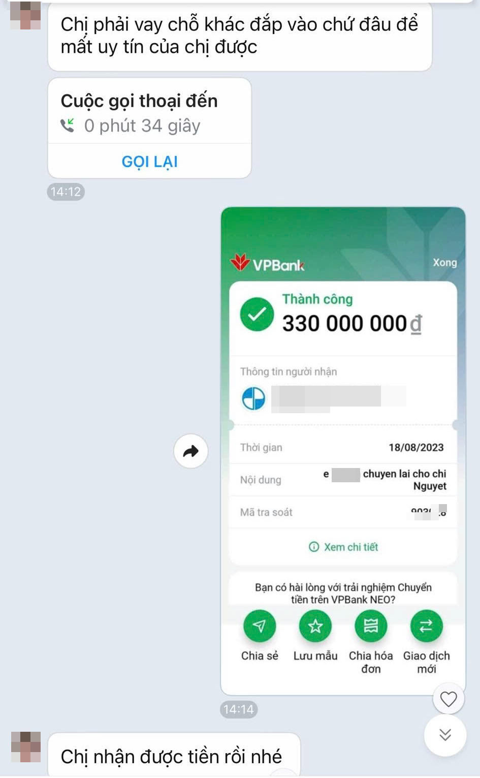 Bà D. còn cung cấp cho cơ quan điều tra nhiều tài liệu, hình ảnh về số tiền giao dịch, trả lãi tiền vay qua ngân hàng, tin nhắn đòi nợ qua Zalo của bà Nguyệt...