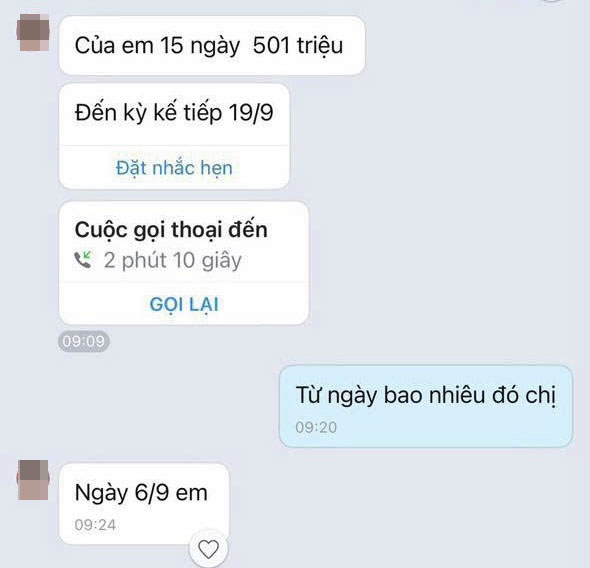 Điển hình, ngày 29-7-2023, bà Nguyệt thu tiền gốc và lãi 10 ngày là 330 triệu đồng. Ngày 7-8-2023, bà D. phải chuyển tiếp cho bà Nguyệt tiền gốc và lãi 330 triệu đồng. Đến ngày 28-8-2023, bà Nguyệt yêu cầu bà D. chuyển tiền 15 ngày là hơn 500 triệu đồng.