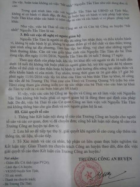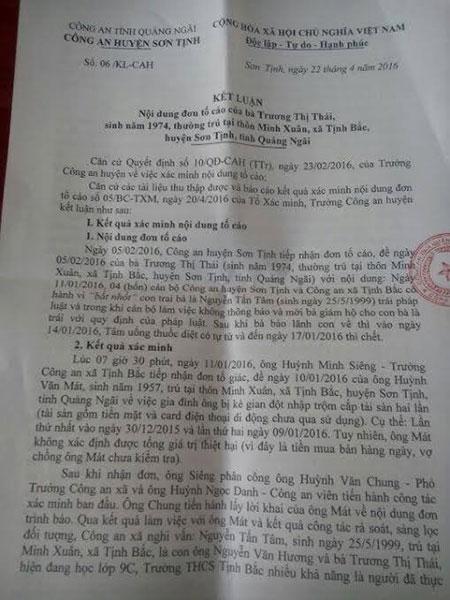 Kết luận của Công an huyện Sơn Tịnh |