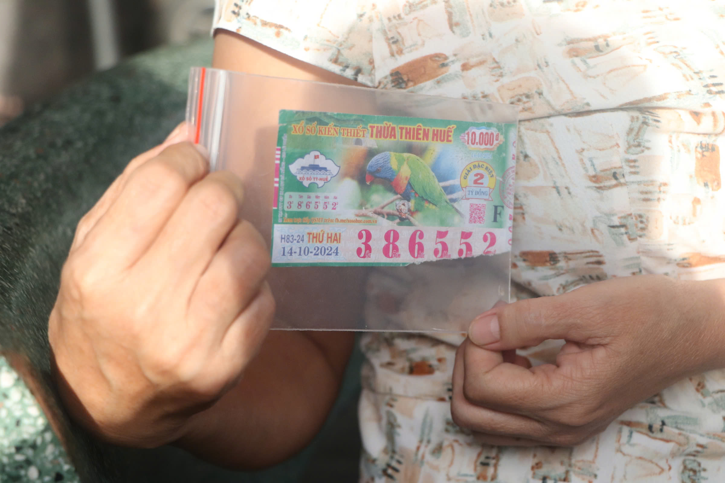 Như đã đưa tin, bà Ng. là chủ nhân của tờ vé số mang số dự thưởng 386552 (F), do Công ty TNHH Nhà nước MTV xổ số kiến thiết tỉnh Thừa Thiên - Huế phát hành vào ngày 14-10, trúng giải đặc biệt 2 tỉ đồng nhưng không được trả thưởng do tờ vé bị rách "tí tẹo" phía dưới góc phải. Kết quả giám định của Công an tỉnh Thừa Thiên - Huế khẳng định đây là tờ vé số thật, các con số không bị tẩy xoá.