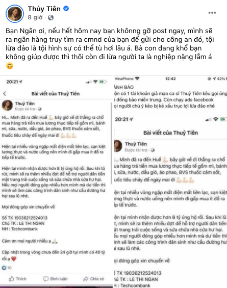 Ngày 18/10, ca sĩ Thủy Tiên đăng tải dòng trạng thái kèm theo hình ảnh cảnh báo việc có fanpage mạo danh mình. Theo đó, fanpage có tên "Thủy Tiên" được tạo từ ngày 16/10 đã mua quảng cáo từ Facebook với nội dung kêu gọi chuyển tiền ủng hộ đồng bào miền Trung gặp khó khăn vì lũ lụt. Số tiền ủng hộ được trang này yêu cầu gửi đến tài khoản: 19036212***013 của Le Thi N. (ngân hàng Techcombank).