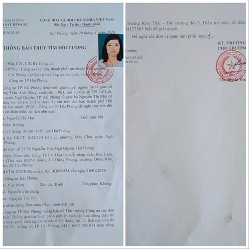 Cụ thể, vào ngày 22/5, CQĐT Công an TP Hải Phòng có Thông báo truy tìm đối tượng Nguyễn Thị Mai (SN 1983), Đăng ký HKTT: 8/28/320 Lê Lai, Máy Chai, quận Ngô Quyền, theo đơn tố giác tội phạm của 6 tổ chức cá nhân bị chiếm đoạt hơn 200 tỷ đồng.