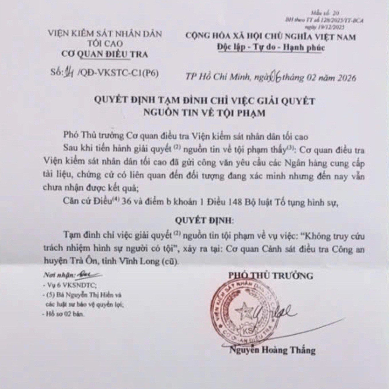 Theo trao đổi với báo Dân Trí, bà Nguyễn Thị Hiền (mẹ nạn nhân), gia đình bà đã theo đuổi đơn tố giác nhắm vào một số cán bộ thuộc Cơ quan điều tra Công an và VKSND huyện Trà Ôn (cũ), tỉnh Vĩnh Long. Nội dung tố cáo tập trung vào hành vi "Không truy cứu trách nhiệm hình sự người có tội" trong quá trình giải quyết vụ tai nạn giao thông xảy ra ngày 4/9/2024, khiến em Tr. thiệt mạng.