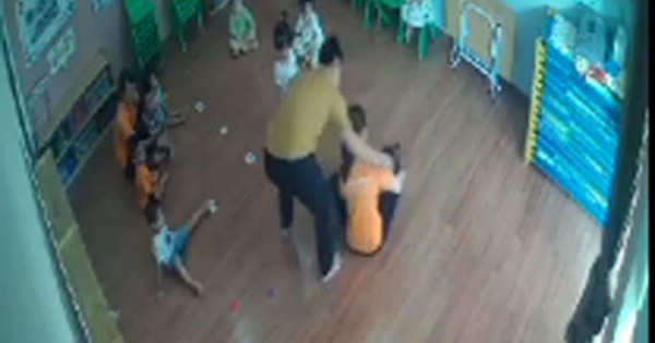 Lúc sau, một người đàn ông xông vào lớp, tiến đến vị trí cô giáo, giật tóc và tát thẳng vào mặt bé gái khiến cháu loạng choạng, khóc. Chưa dừng lại, người đàn ông còn túm tóc giật ngửa cháu ra phía sau, đánh vào mông cháu bé rồi chỉ tay vào mặt cháu quát mắng, bắt khoanh tay xin lỗi. Hai cô giáo gần như không có phản ứng gì trước hành động hung hãn của người đàn ông.