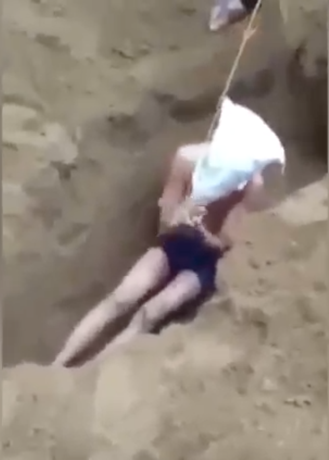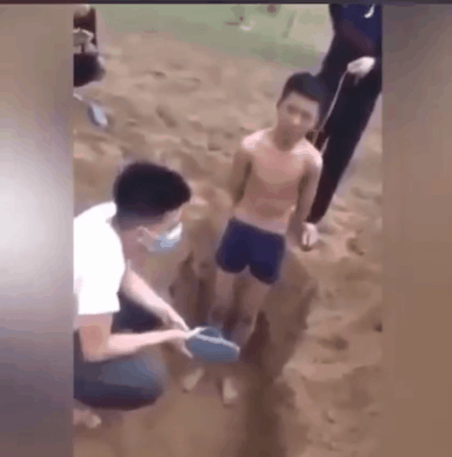 Cụ thể, clip ghi lại cảnh N.Q.V. (17 tuổi, trú thị trấn Xuân An, Nghi Xuân) bị trói tay phía sau đứng dưới một hố cát đã được đào sẵn.
