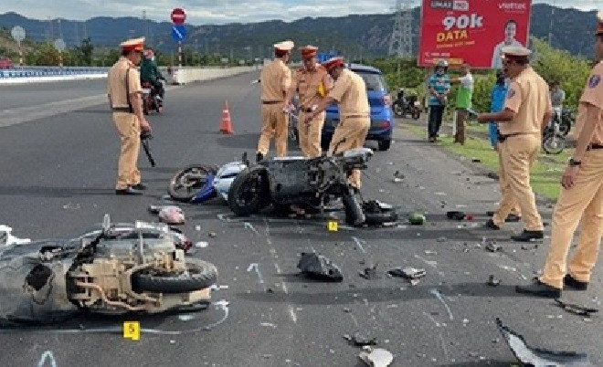 Cú va chạm làm 5 người đi xe máy bị thương, trong đó 1 người phụ nữ bị thương nặng. Ô tô BKS 60A-668.00 và 5 xe máy đều hư hỏng.