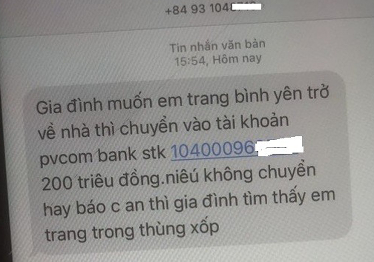 Chiều 21/2, điện thoại của bà Đinh Thị Toan (SN 1982, quê quán Thái Bình, mẹ đẻ cháu Trang) nhận được tin nhắn đe dọa tống tiền của người lạ với nội dung: “Gia đình muốn em Trang bình yên trở về nhà thì chuyển vào tài khoản pvcom bank stk: 104000969XX. 200 triệu đồng, nếu không chuyển hay báo công an thì gia đình tìm thấy em Trang trong thùng xốp”.