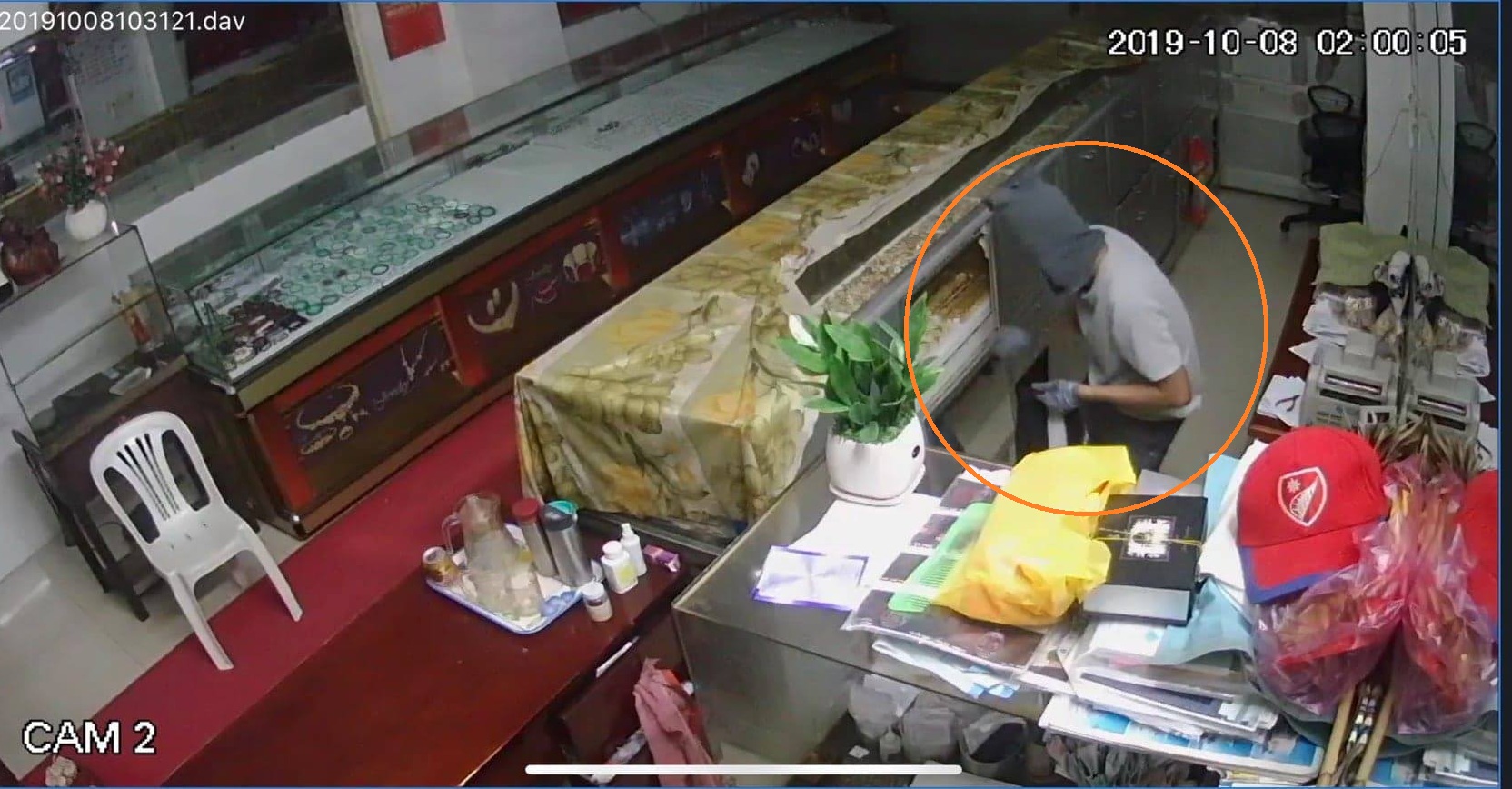 Bước đầu qua trích xuất camera, phát hiện khoảng thời gian từ 1h – 2h sáng, 1 tên trộm bịt kín mặt, đột nhập vào tiệm vàng tại tầng trệt, sau đó lục tung các tủ đựng vàng lấy trộm rồi nhanh chóng tẩu thoát.