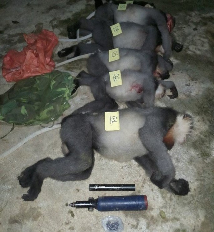 Tại hiện trường, đoàn kiểm tra thu giữ tang vật gồm 5 con voọc chà vá chân xám (đã bị bắn chết) có trọng lượng từ 8-15 kg/con, 1 xe máy, 1 bình hơi cay (dùng để nạp hơi cho súng tự chế), 53 viên đạn chì, 1 ống giảm thanh.