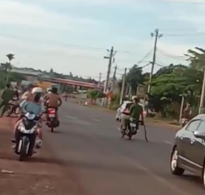 Trong clip, người mặc áo ngành công an đầu trần cầm khúc cây và được người dân chở đi để rượt người khác.