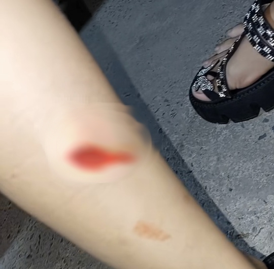 Sau đó, 2 đối tượng trên vượt lên chặn đầu xe, dùng vật giống súng hơi bắn một phát trúng vào mũ bảo hiểm của người chồng và một phát trúng vào bắp chân trái người vợ. Một người còn cầm dao chém vào chân người chồng, nhưng do quần dày và trúng vào chiếc điện thoại nên người chồng không sao.