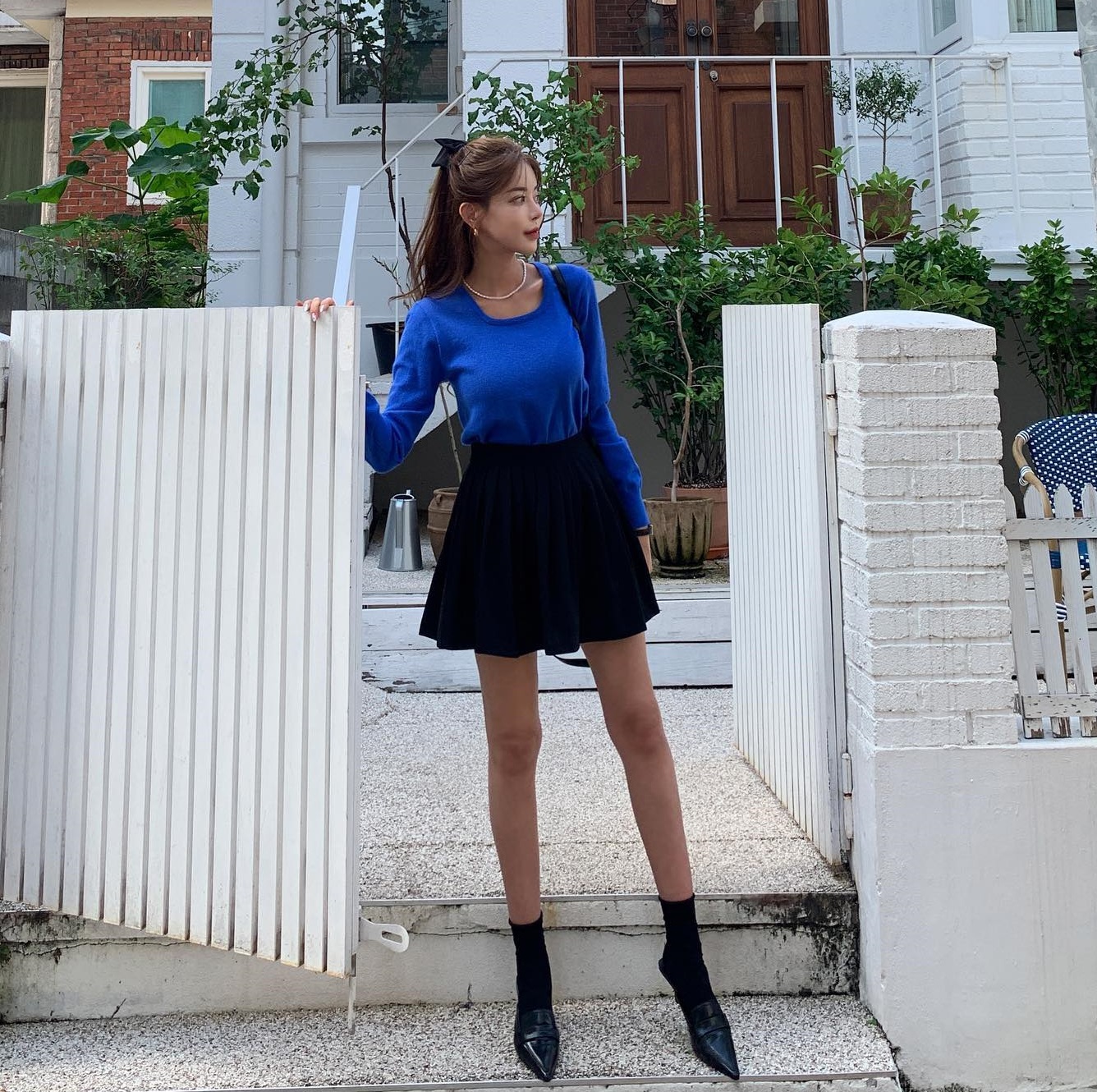 Không khó để mặc đẹp với áo len màu xanh đậm, chị em hãy kết hợp item này với chân váy ngắn tông màu đen và giày màu trung tính. Như vậy, vẻ ngoài vừa nổi bật, vừa sang xịn mịn. Chiếc vòng cổ ngọc trai dù chỉ là món phụ kiện nhỏ nhưng giúp "thắp sáng" outfit và cộng thêm điểm nữ tính, yêu kiều.