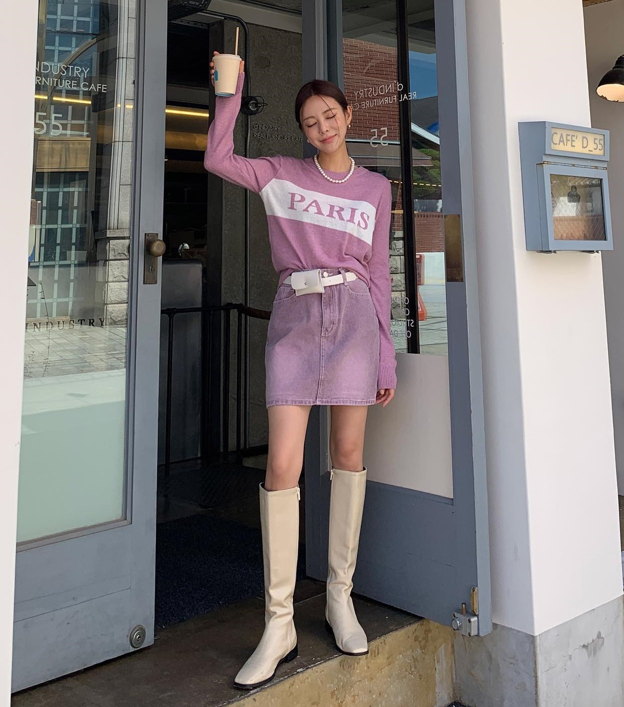 Set đồ trên là gợi ý đáng tham khảo nếu bạn muốn mặc đẹp với tông màu tím. Sự kết hợp giữa áo len và chân váy cùng tông màu tím, được tô điểm thêm vòng cổ ngọc trai, thắt lưng và đôi boots màu trắng mang đến cho người diện vẻ ngoài tươi trẻ, ngọt ngào. Bên cạnh đó, tổng thể trang phục có sự cân bằng chứ không hề khiến vẻ ngoài trở nên "sến sẩm".