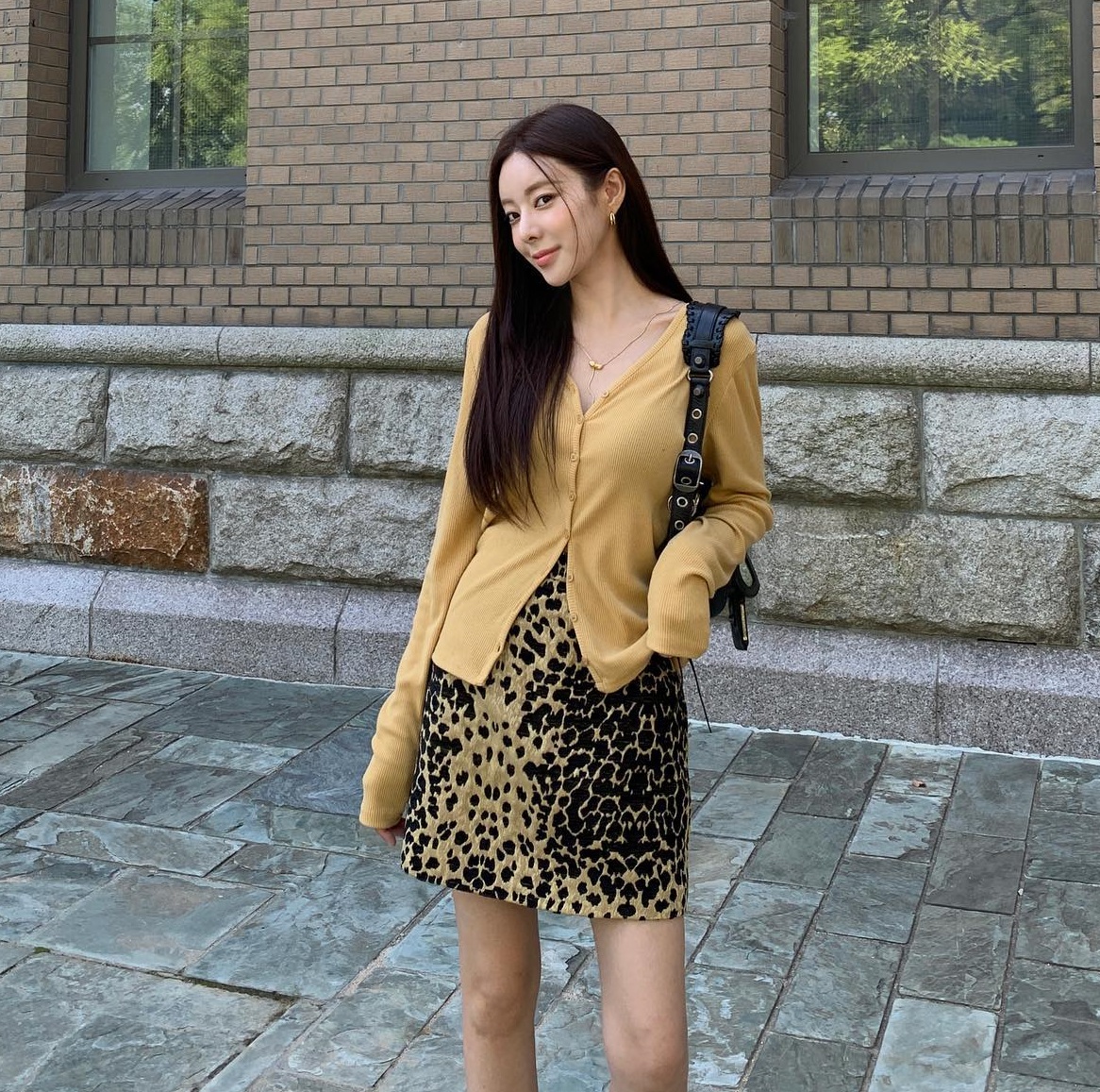 Vào những ngày ấm áp, các nàng có thể áp dụng công thức gồm áo len mỏng kết hợp với chân váy ngắn họa tiết. Set đồ này mang tông màu vàng làm chủ đạo, rất phù hợp với xu hướng hiện tại. Bộ trang phục giúp vẻ ngoài thêm nổi bật nhưng vẫn có sự hài hòa.