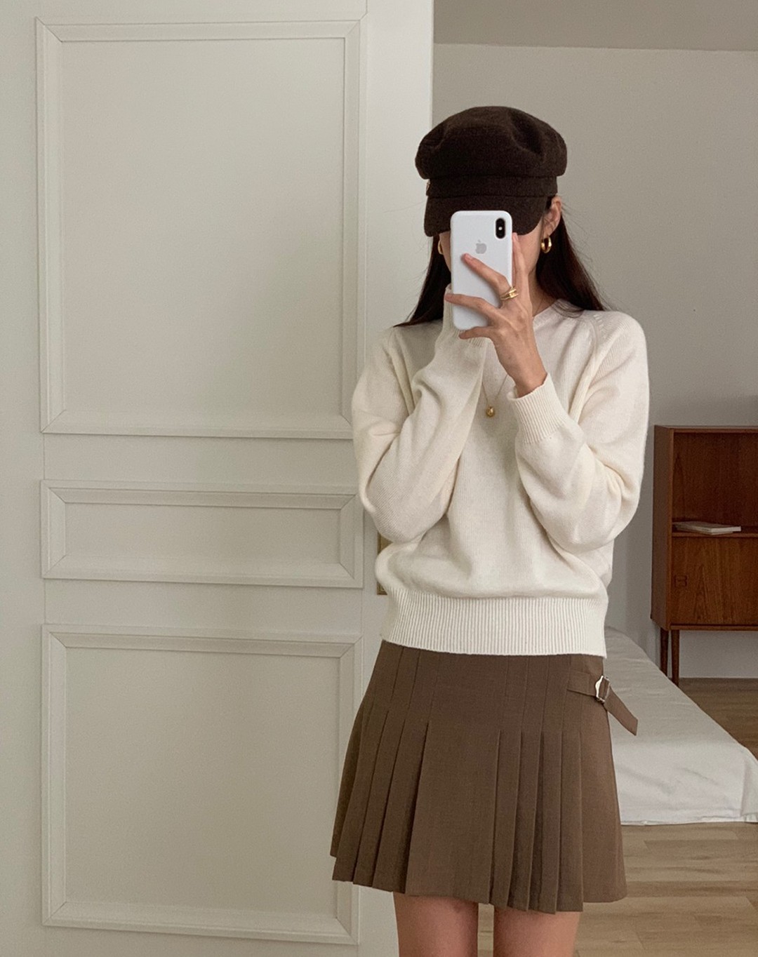 Ưu điểm của công thức áo len trắng và chân váy xếp ly màu nâu chính là sự trang nhã, thanh lịch. Để tổng thể trang phục thêm long lanh, nổi bật, chị em nên tô điểm dây chuyền vàng và khuyên tai tròn. Cuối cùng, chiếc mũ nồi giúp diện mạo trở nên ngọt ngào, sang trọng hơn.
