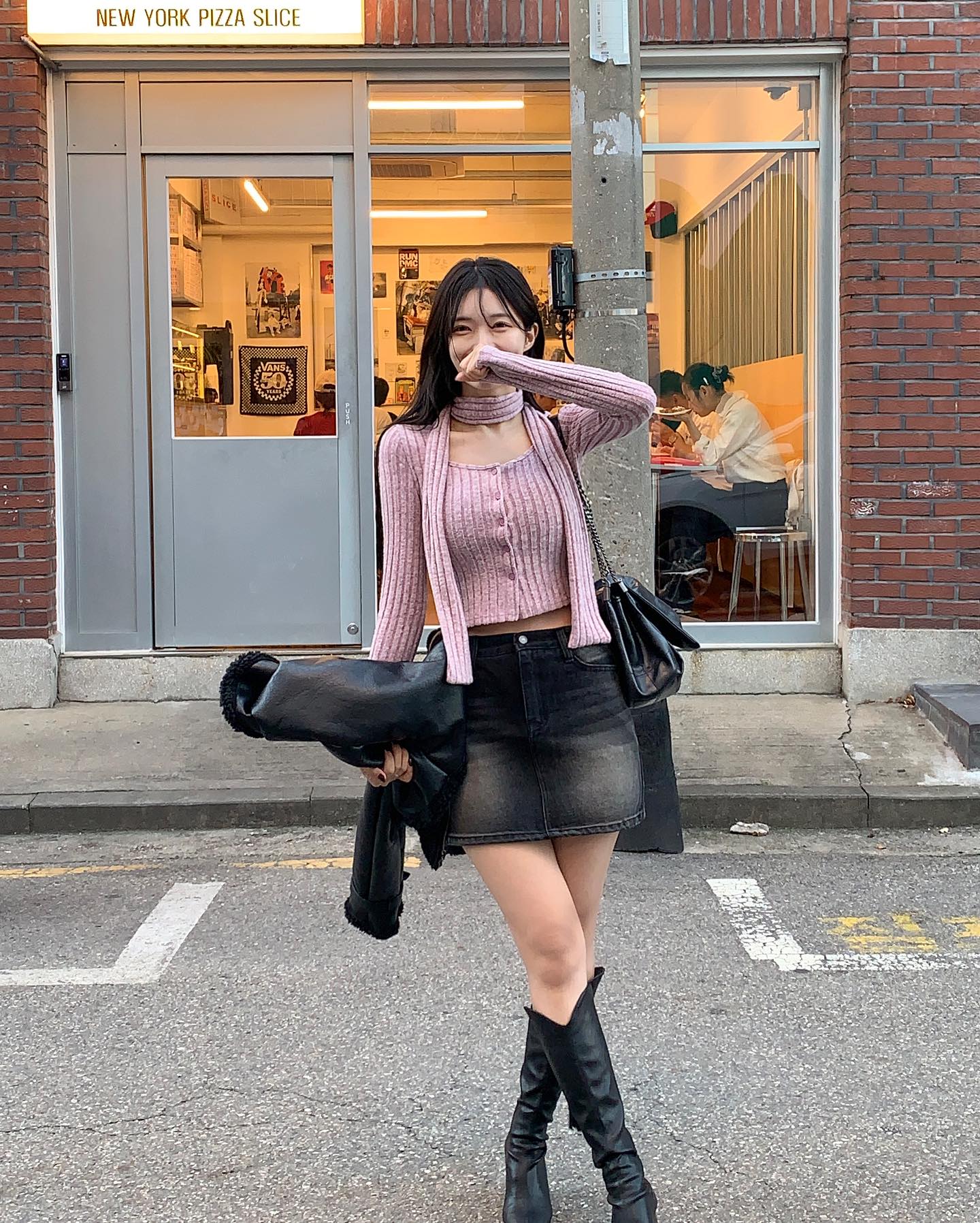 Công thức áo len hồng và chân váy denim ghi điểm ở nét cá tính, bụi bặm. Ngoài ra, sự kết hợp này còn "ăn gian" chiều cao hiệu quả nhờ thiết kế áo len dáng ngắn. Chiếc khăn len mảnh làm tăng thêm nét yêu kiều và sang trọng cho tổng thể trang phục.