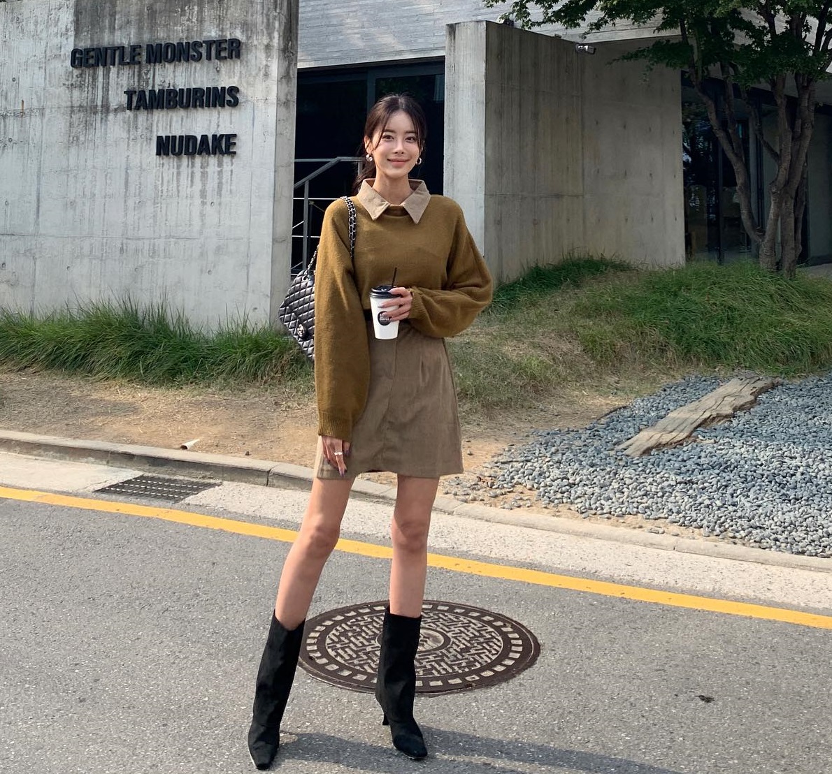 Công thức áo len và chân váy ngắn mang tông màu rêu làm chủ đạo sẽ giúp chị em có vẻ ngoài nổi bật nhưng vẫn trang nhã, tinh tế. Khi layer một chiếc áo sơ mi bên trong áo len, diện mạo của người diện sẽ thêm phần trẻ trung, thanh lịch. Các nàng có thể tô điểm một đôi khuyên tai tròn để tổng thể thêm long lanh, sang trọng.