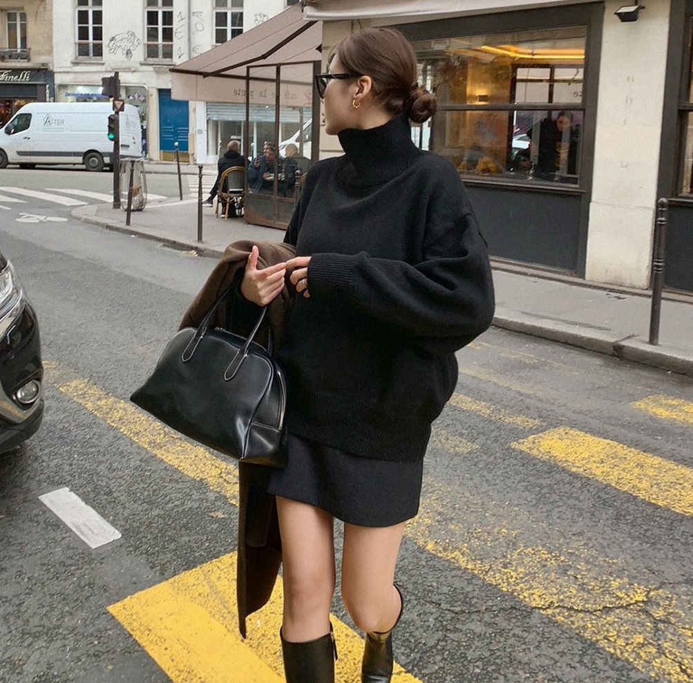 Yêu thích phong cách tối giản, chị em hãy tham khảo công thức gồm áo len kết hợp với chân váy ngắn cùng tông màu đen. Khi bỏ qua thao tác sơ vin, tổng thể trang phục có sự phóng khoáng, thoải mái nhưng hiệu quả tôn dáng không hề giảm. Đôi boots cao cổ chính là kiểu giày hoàn hảo để kết hợp cùng chân váy ngắn.