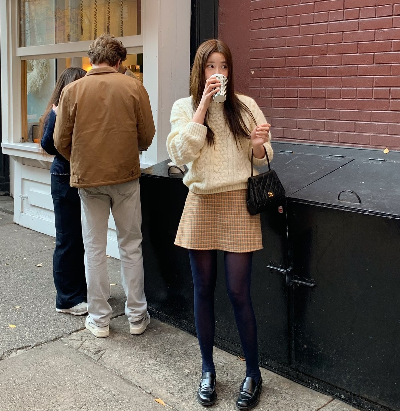 Áo len trắng và chân váy kẻ ô, tông màu be sẽ tạo nên bộ trang phục rất nhẹ nhàng, thanh lịch. Đây là công thức nàng nào cũng có thể mặc đẹp. Để giữ ấm hiệu quả, các nàng nên diện quần tất đen. Món phụ kiện này còn nâng cấp vẻ sang trọng cho bộ đồ. Đôi loafer chính là mảnh ghép hoàn hảo của bộ trang phục.