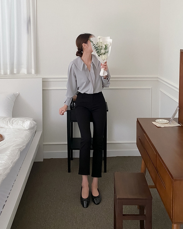 Trong những ngày mùa xuân ấm áp, bạn rất nên áp dụng công thức gồm áo blouse màu xanh xám kết hợp với quần ống bó tông màu đen. Công thức này nữ tính và thanh lịch nhưng cũng không kém phần tươi trẻ, ngọt ngào. Đôi giày búp bê tối giản đã đảm bảo nét tinh tế cho tổng thể bộ đồ.