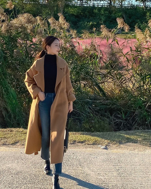 Vào những ngày lạnh, công thức quần jeans ống bó kết hợp với áo cổ cao, áo khoác dạ màu nâu trà sữa là lựa chọn lý tưởng dành cho chị em. Bộ trang phục này vừa có sự trẻ trung, vừa ghi điểm thanh lịch. Nhờ thao tác sơ vin mà chiều cao được "hack" hiệu quả ngay cả khi bạn diện áo dáng dài. Đôi boots thấp cổ đã giúp nâng tầm cho outfit này.