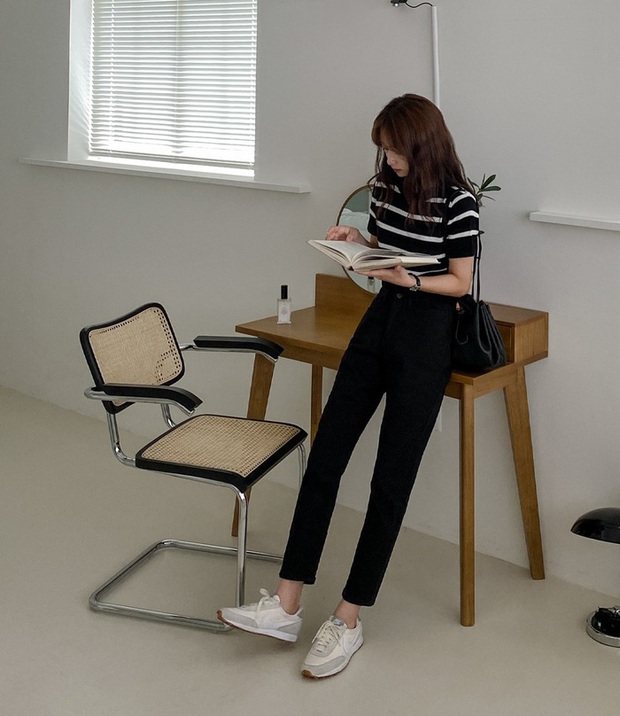 Thêm một công thức diện đồ năng động, tươi trẻ nhưng không "lệch pha" với phong cách công sở, đó là combo áo kẻ ngang kết hợp với quần đen ống bó, sneaker trắng. Các nàng nên sơ vin gọn gàng để vẻ ngoài thêm thanh lịch. Không chỉ phù hợp với những ngày mùa xuân ấm áp, bạn còn có thể áp dụng công thức trên vào mùa hè.