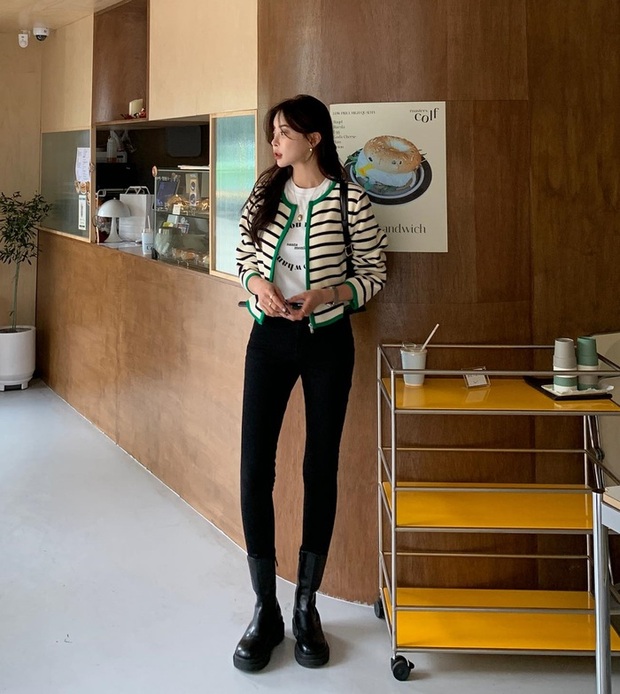 Trẻ trung và năng động chính là ưu điểm của công thức gồm áo thun trắng kết hợp với cardigan họa tiết, quần jeans đen ống bó, boots đen. Để trẻ hóa phong cách đi làm, chị em rất nên tham khảo công thức diện đồ trên.
