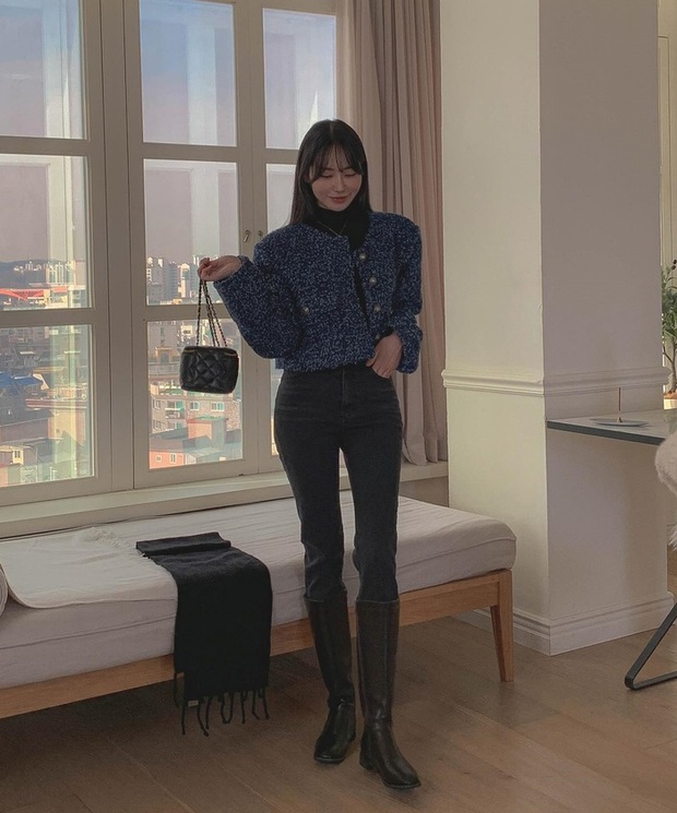 Bộ trang phục trên vừa có sự nổi bật, vừa sang trọng, yêu kiều. Điểm nhấn của outfit là chiếc áo khoác mang tông màu xanh đậm. Ngoài ra, khi kết hợp quần ống bó tông màu đen với boots cao cổ, đôi chân còn được kéo dài hơn, vóc dáng thêm phần cao ráo.