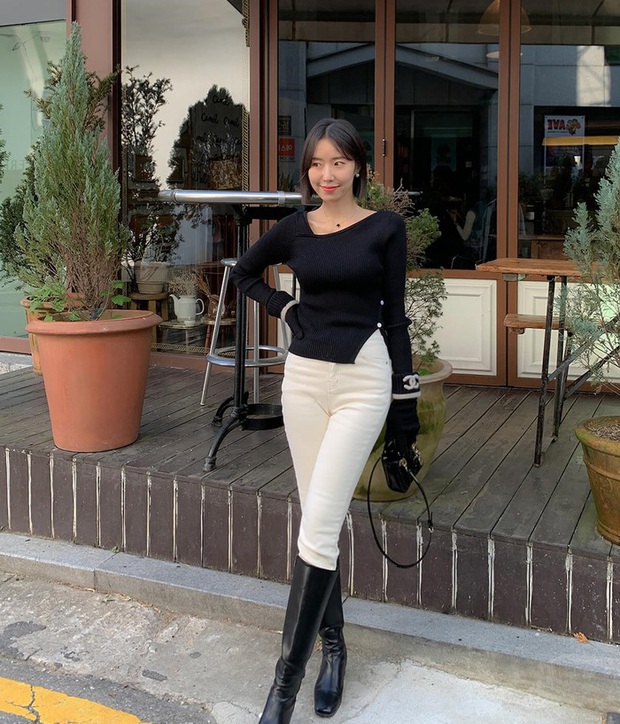 Mẫu áo len xẻ tà đã tạo điểm nhấn nổi bật cho bộ trang phục. Trong khi đó, quần jeans trắng có vai trò thắp sáng outfit, giúp vẻ ngoài của người mặc thêm trẻ trung. Để nâng tầm vẻ sang trọng cho bộ trang phục, đôi boots cao cổ là lựa chọn lý tưởng.