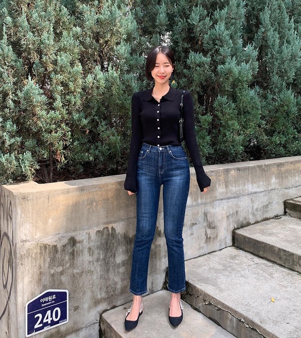Set đồ trên tôn dáng rất hiệu quả nhờ thiết kế áo len cổ bẻ, quần jeans ôm gọn vóc dáng. Dẫu vậy, chị em vẫn nên sơ vin để công dụng "hack" chiều cao được phát huy tối ưu ngay cả khi đi giày bệt. Một chiếc túi xách màu trung tính là lựa chọn lý tưởng để đảm bảo nét trang nhã cho outfit công sở.