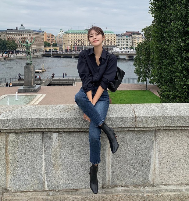 Nếu kết hợp áo sơ mi tối màu với quần jeans ống bó, chị em sẽ không lo bị cộng tuổi, trái lại vẻ ngoài còn ghi điểm hiện đại và trẻ trung. Thao tác sơ vin khó có thể thiếu khi hoàn thiện những outfit công sở. Cuối cùng, một đôi boots thấp cổ sẽ giúp bộ cánh trở nên nổi bật hơn.
