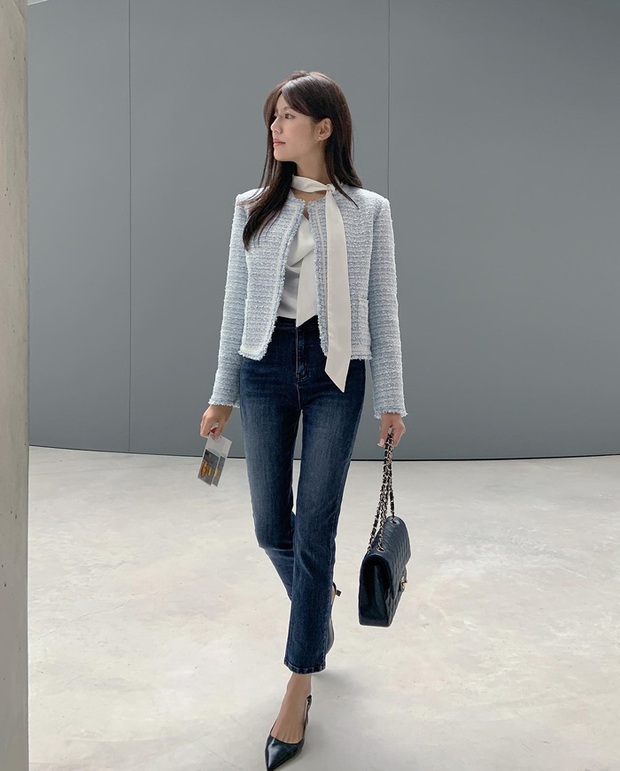 Áo khoác vải tweed là bảo chứng cho vẻ ngoài thanh lịch, sang trọng và món đồ này cũng rất phù hợp để mặc tới công sở. Sự kết hợp giữa áo khoác vải tweed, áo blouse trắng và quần jeans ống bó đã tạo nên bộ trang phục trẻ trung cho người diện. Đôi giày cao gót mũi nhọn cho hiệu quả tôn dáng tối ưu và ăn nhập với outfit sang trọng.