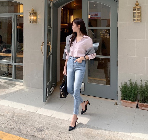 Áo sơ mi màu hồng pastel tiếp tục trở thành xu hướng, dù đã bước sang mùa thu. Khi kết hợp áo sơ mi hồng pastel với quần skinny, người mặc ghi điểm nữ tính, ngọt ngào. Đôi giày slingback cho hiệu quả "kéo chân" dài và giúp vóc dáng cao ráo hơn. Chi tiết áo len quàng vai đã cộng thêm điểm thời thượng cho tổng thể trang phục.