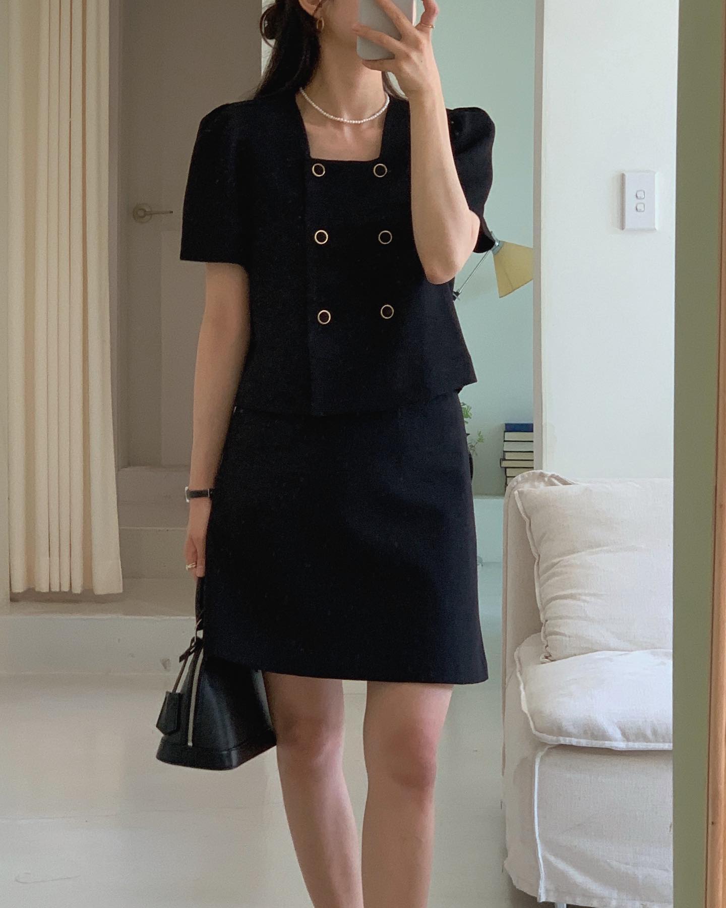 Trang phục màu đen luôn là lựa chọn lý tưởng để diện trong những ngày mưa. Công thức áo cổ vuông và chân váy đồng bộ có sự sang trọng, quý phái. Dẫu vậy, bộ đồ không hề cộng tuổi cho người diện nhờ thiết kế chân váy ngắn. Khi tô điểm chiếc vòng cổ ngọc trai, tổng thể trang phục thêm nổi bật, long lanh.
