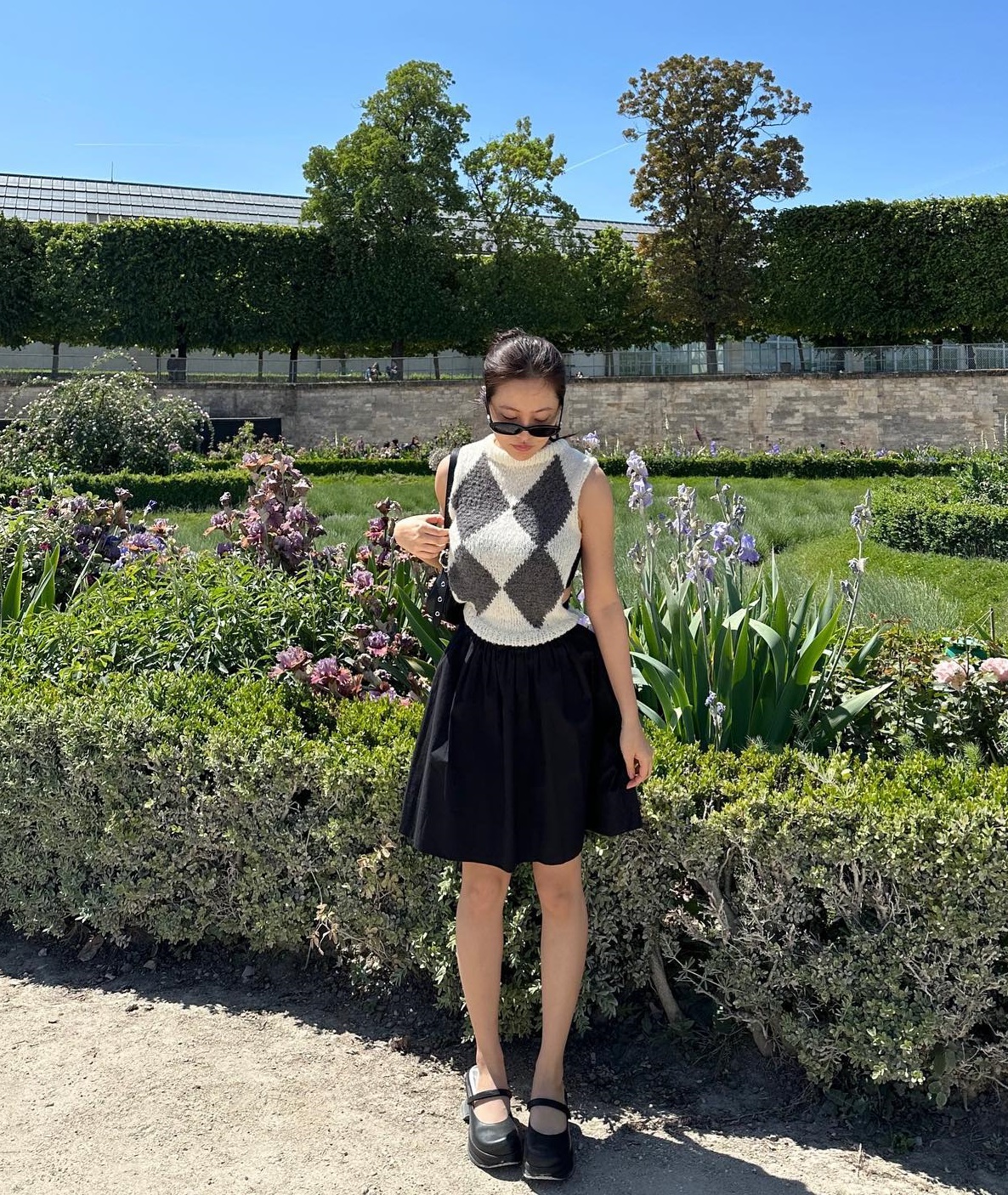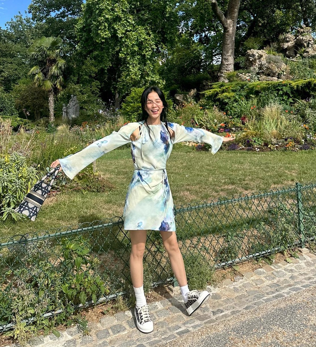 Mẫu váy ngắn họa tiết của Jisoo có nét dịu dàng, trang nhã. Dẫu vậy, mẫu váy vẫn "hack" tuổi hiệu quả, đặc biệt là khi được kết hợp với giày thể thao năng động. Đường nhấn eo của mẫu váy mang đến sự chỉn chu, đồng thời tăng thêm độ cao ráo, thanh thoát cho tổng thể.
