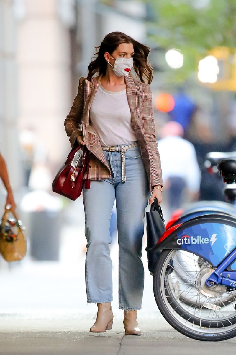 Áo blazer và quần jeans là bộ đôi trang phục quen thuộc trong mùa lạnh. Nhờ sự xuất hiện của chiếc áo thun trắng, bộ trang phục của Anne Hathaway càng được "hack" tuổi hiệu quả. Đôi giày màu be không chỉ giúp "ăn gian" chiều cao mà còn cộng thêm điểm tinh tế cho người mặc.