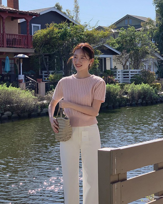 Nàng công sở hãy tô điểm thêm màu sắc cho phong cách đi làm bằng những món đồ mang tông màu pastel. Công thức áo len hồng pastel kết hợp cùng quần trắng mang đến nét ngọt ngào, tươi trẻ. Bên cạnh đó, bộ trang phục vẫn có sự hài hòa và thanh lịch.