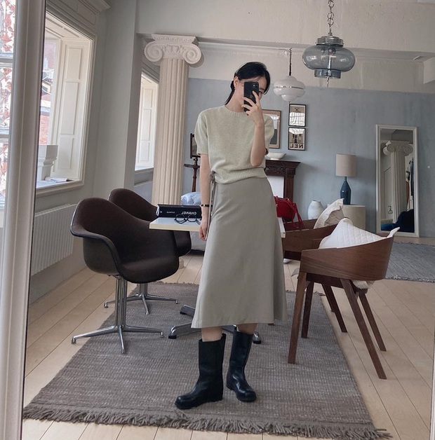 Áo len cộc tay và chân váy suông đã tạo nên set trang phục nhẹ nhàng, tinh tế cho người diện. Tổng thể bộ cánh trở nên ấn tượng hơn nhờ đôi boots cao cổ. Không chỉ giúp nàng công sở ghi điểm sành điệu, cách phối đồ này còn tôn dáng cao ráo và thon thả.