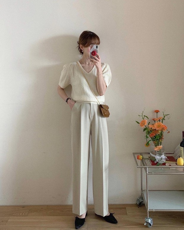 Ưu điểm của áo len cổ tim chính là sự nữ tính, mềm mại. Mẫu áo này còn tạo hiệu ứng vóc dáng thanh thoát hơn. Yêu thích phong cách tối giản, chị em có thể kết hợp áo len cổ tim, tông màu trắng với quần âu có đường ly giữa. Đôi giày mũi nhọn không chỉ phù hợp với nét trang nhã của bộ đồ, mà còn góp phần tôn dáng.