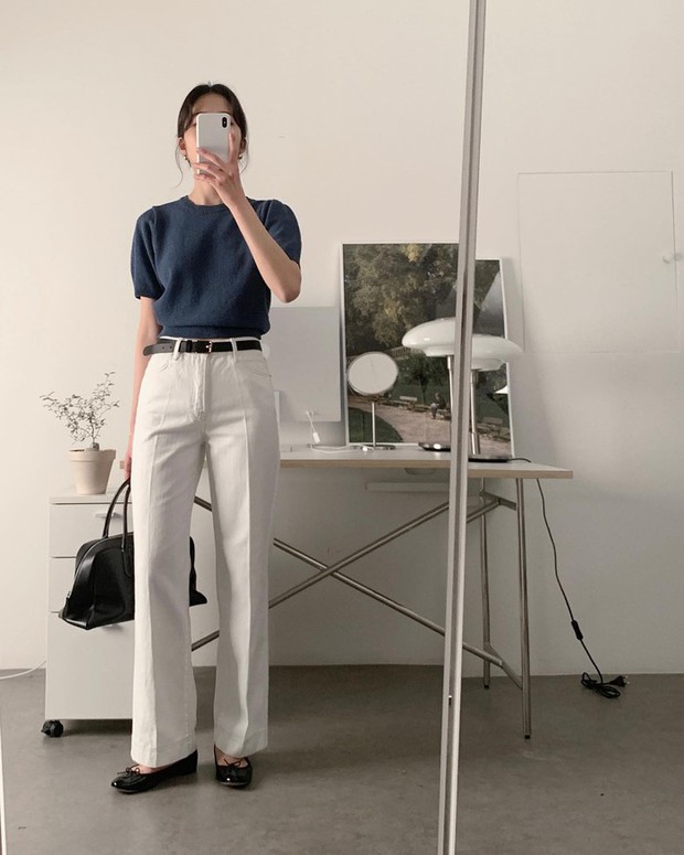 Áo len màu xanh xám gây ấn tượng ở sự sang trọng và tôn da hiệu quả. Bạn nên kết hợp mẫu áo này với quần trắng để bộ trang phục thêm phần tươi tắn, trẻ trung. Công thức này cũng mang đến cho người diện sự trang nhã. Cuối cùng, những món thời trang như túi xách, giày búp bê, thắt lưng tông màu đen đã hoàn thiện bộ cánh tinh tế và hài hòa.