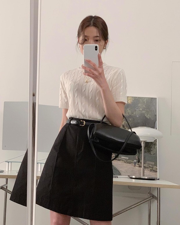 Công thức áo len cộc tay màu trắng và chân váy ngắn có nhiều ưu điểm, như là sự thanh lịch, chỉn chu. Bên cạnh đó, bộ trang phục còn tôn dáng tốt và giúp vẻ ngoài thêm tươi trẻ. Nàng công sở đừng quên tô điểm một chiếc thắt lưng mảnh. Đây là món phụ kiện nhỏ nhưng có tác dụng nâng tầm phong cách.