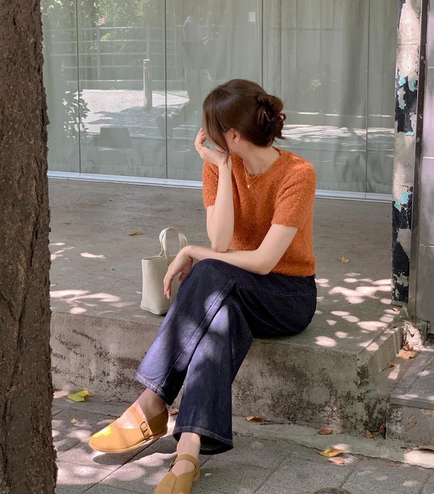Các nàng đừng bỏ qua những mẫu áo màu sắc khi hoàn thiện phong cách. Kết hợp áo len cộc tay màu cam với quần jeans xanh tím than, người mặc có được bộ trang phục nổi bật, tươi tắn mà vẫn có sự hài hòa. Đôi giày Mary Jane màu be đảm bảo sự chỉn chu cho set đồ công sở.