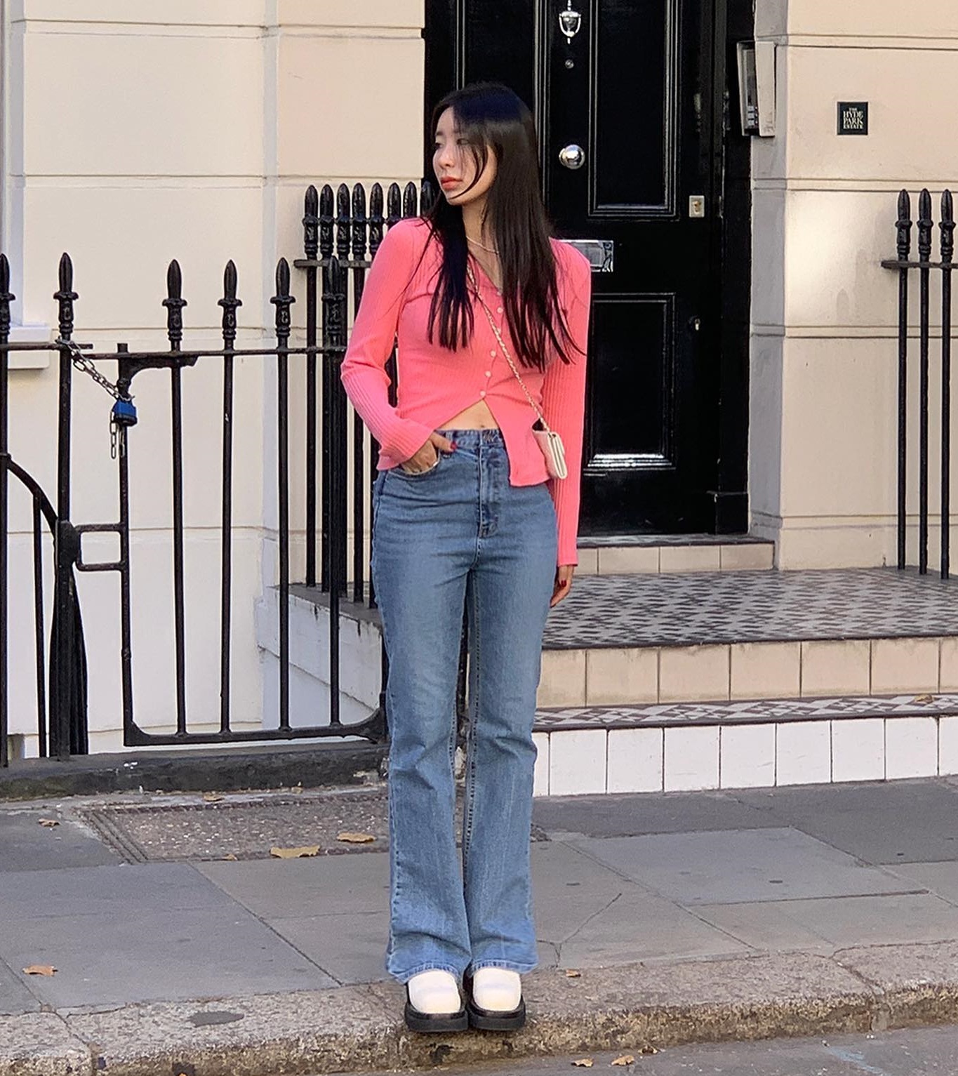 Ngọt ngào, trẻ trung chính là ấn tượng về set đồ gồm áo len màu hồng và quần jeans xanh. Nhờ thiết kế áo lửng và quần jeans cạp cao, vóc dáng của người mặc còn thêm cao ráo mà không cần sơ vin.