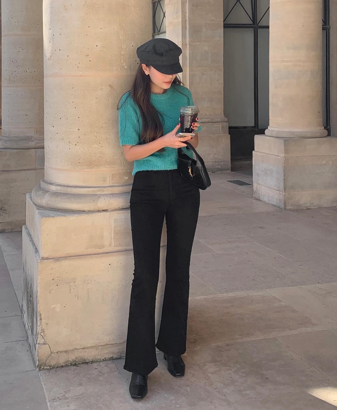 Trong những ngày ấm áp, chị em vẫn có thể "tái chế" áo len cộc tay của mùa thu để tạo nên outfit sành điệu. Sự kết hợp giữa áo len cộc tay màu xanh lá và quần đen ống vẩy giúp người mặc có vẻ ngoài trẻ trung, thanh lịch. Bộ trang phục này còn cho hiệu quả tôn dáng tối ưu nhờ mẫu áo lửng và thiết kế quần ống vẩy có độ dài vừa phải.