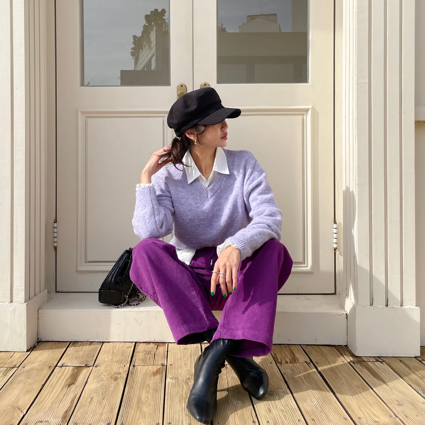 Diện áo len với áo sơ mi trắng cũng là cách hay để tạo nên bộ trang phục hài hòa, thanh lịch. Ngay cả khi kết hợp áo len tím nhạt với một chiếc quần nhung nổi gân, màu tím đậm, tổng thể trang phục vẫn rất sang xịn mịn, không đem lại cảm giác rối mắt. Cuối cùng, đôi boots đen và chiếc mũ nồi đã nâng tầm outfit hiệu quả.