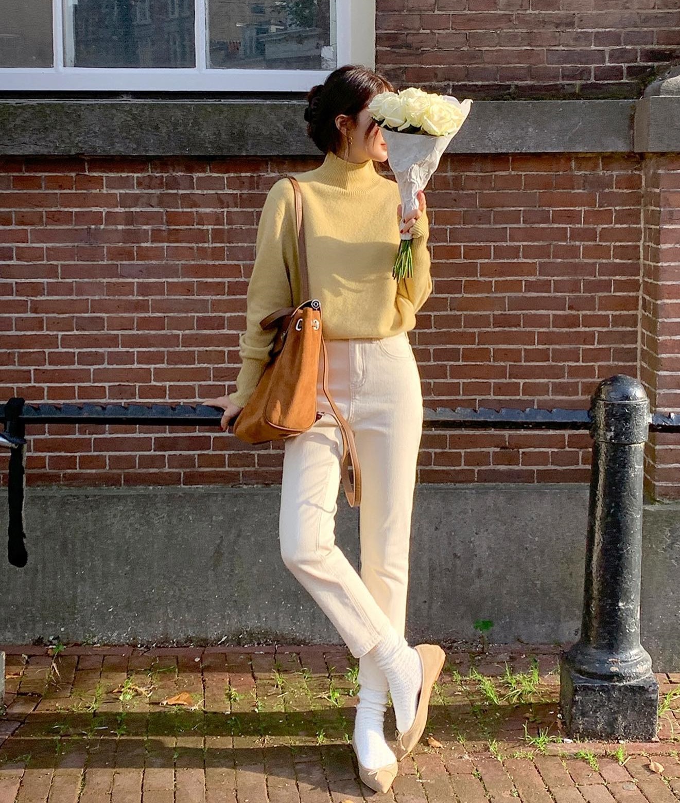 Áo len vàng nhạt mang đến nét tươi tắn và rạng rỡ cho người mặc. Quần jeans trắng là lựa chọn lý tưởng để kết hợp với áo len vàng nhạt. Hai món đồ này sẽ tạo nên bộ trang phục nhã nhặn, tinh tế và "hack" tuổi rất hiệu quả. Để đảm bảo sự hài hòa cho tổng thể trang phục, chị em nên chọn giày dép và túi xách mang tông màu be.
