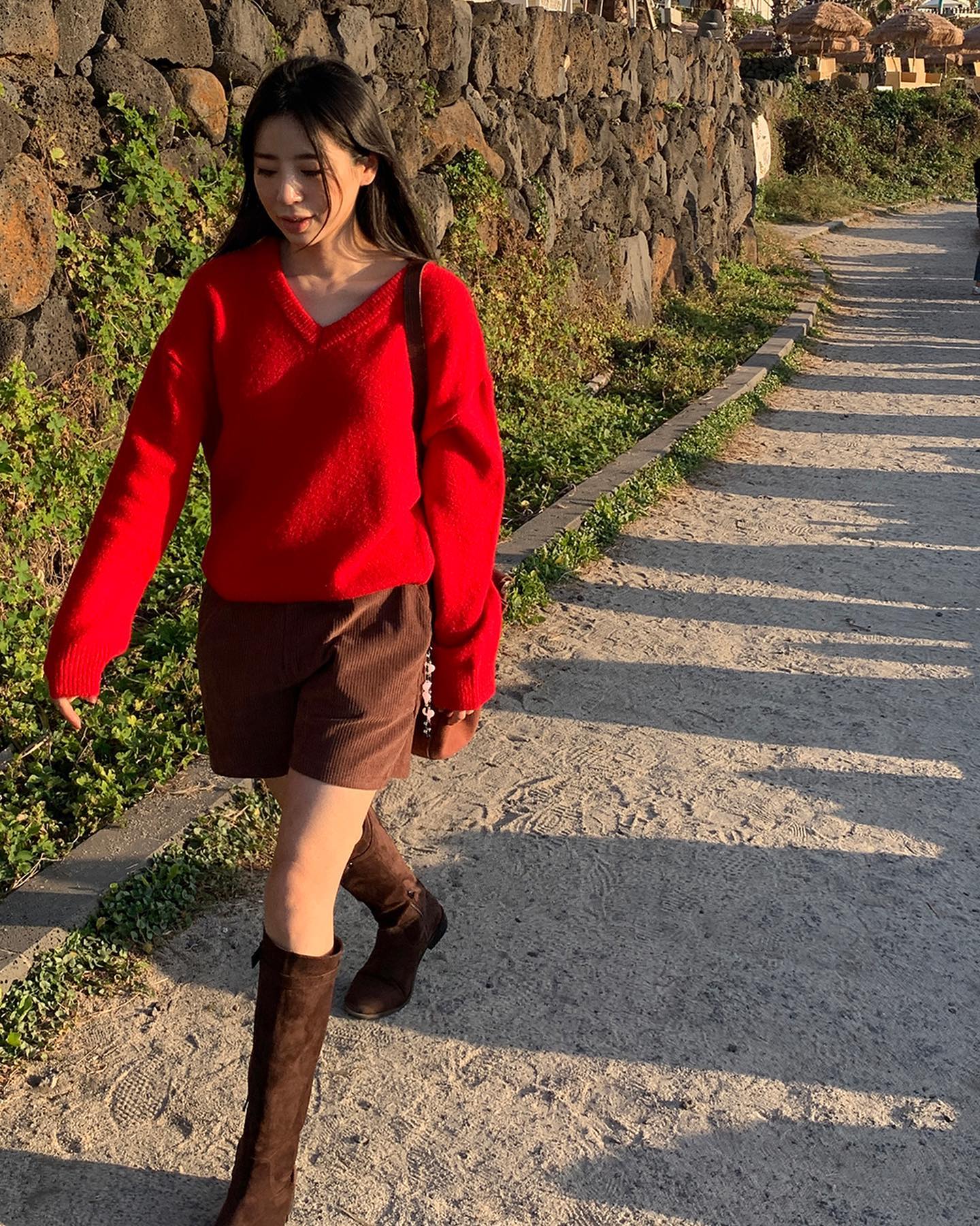 Thêm một ý tưởng diện áo len đỏ rất sang trọng mà chị em nên tham khảo, đó là kết hợp với quần short và boots cao cổ tông màu nâu. Các món đồ mang gam màu trung tính đã giúp cân bằng tổng thể trang phục, đồng thời tôn da sáng hồng, rạng rỡ.