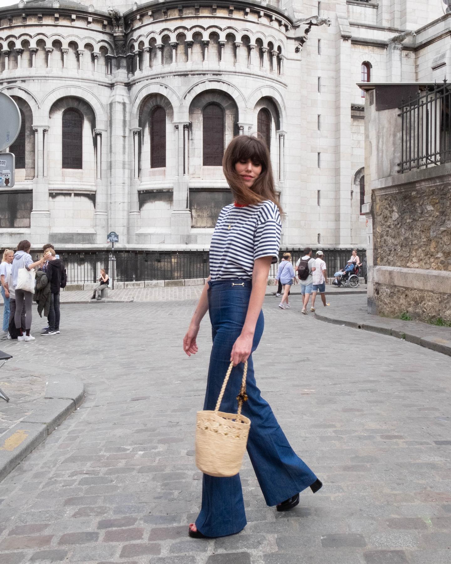 Áo thun kẻ ngang là món đồ không bao giờ lỗi mốt. Sự kết hợp giữa áo thun kẻ ngang và quần jeans ống loe đã tạo nên bộ trang phục nổi bật, phảng phất nét cổ điển. Thao tác sơ vin gọn gàng và đôi giày cao gót giúp "hack" chân thon dài, tôn dáng tối ưu.